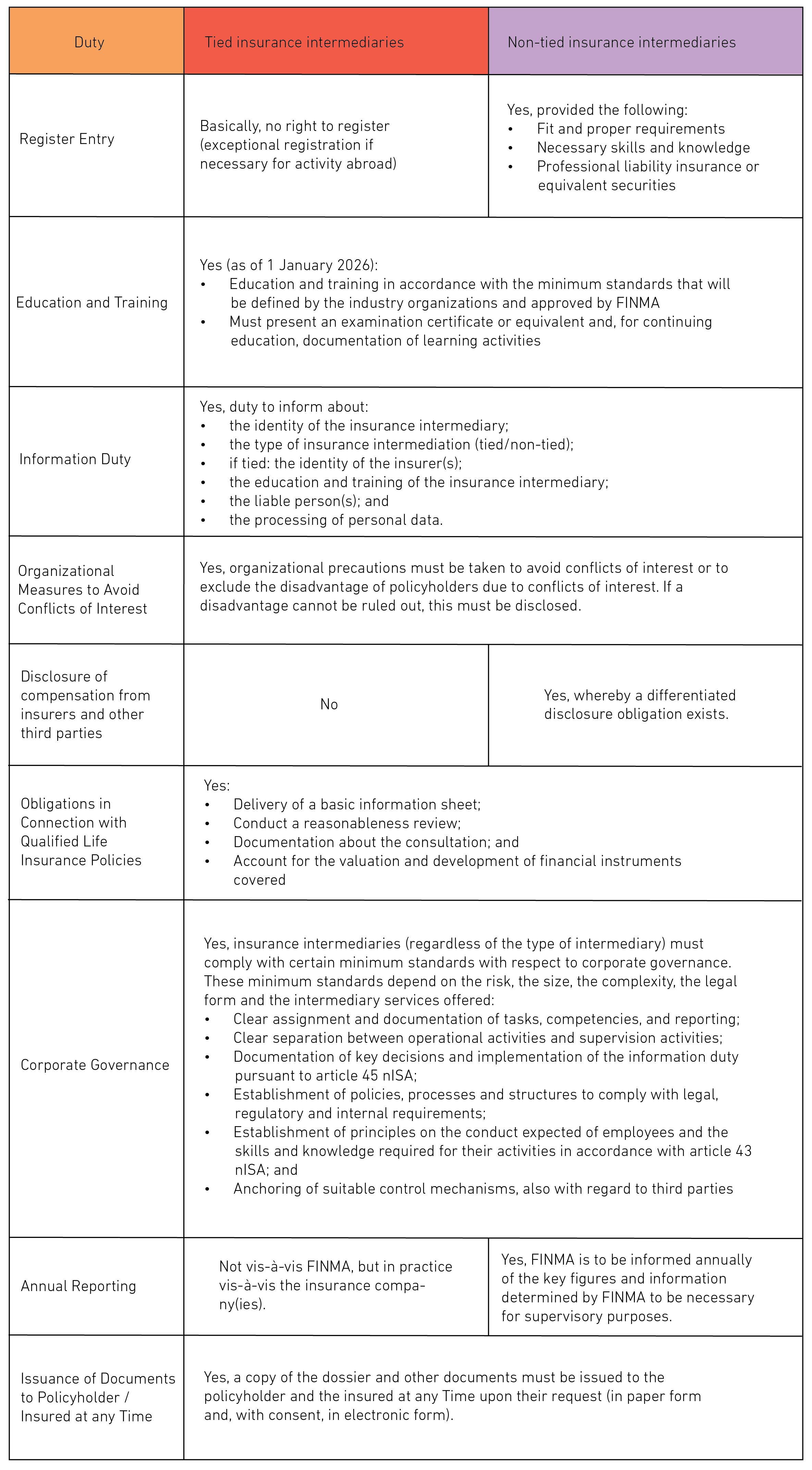 If an non-tied insurance intermediary no longer meets the requirements for the entry in the intermediary register, it will have to be deleted and the non-tied insurance intermediary may no longer engage in non-tied insurance intermediation activities. This may primarily affect foreign non-tied insurance intermediaries who must now have their registered office, place of residence or branch office in Switzerland (exceptions reserved, but there is an obligation to designate a Swiss domicile for service).